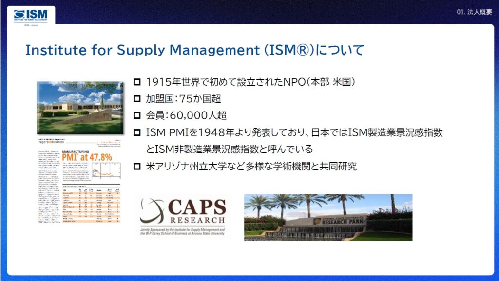 NPO ISM Japan is the exclusive partner of ISM. ISM is the largest non-profit association for Supply Management Professional since 1915 and is famous for ISM Index such as PMI referred by global business persons and for CPSM which is the most recognized certificate for purchasing, procurement and SCM professionals in the world.